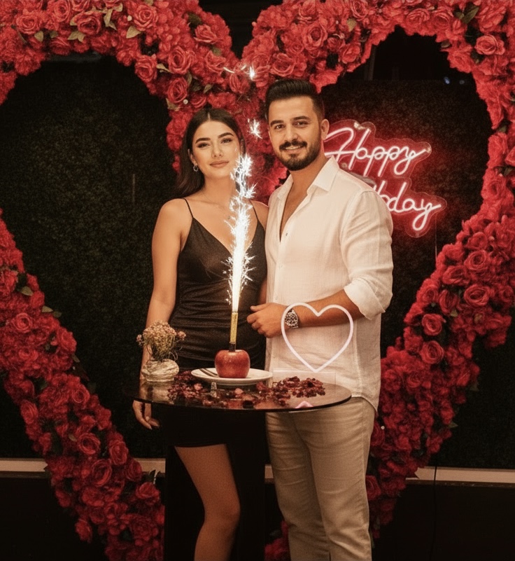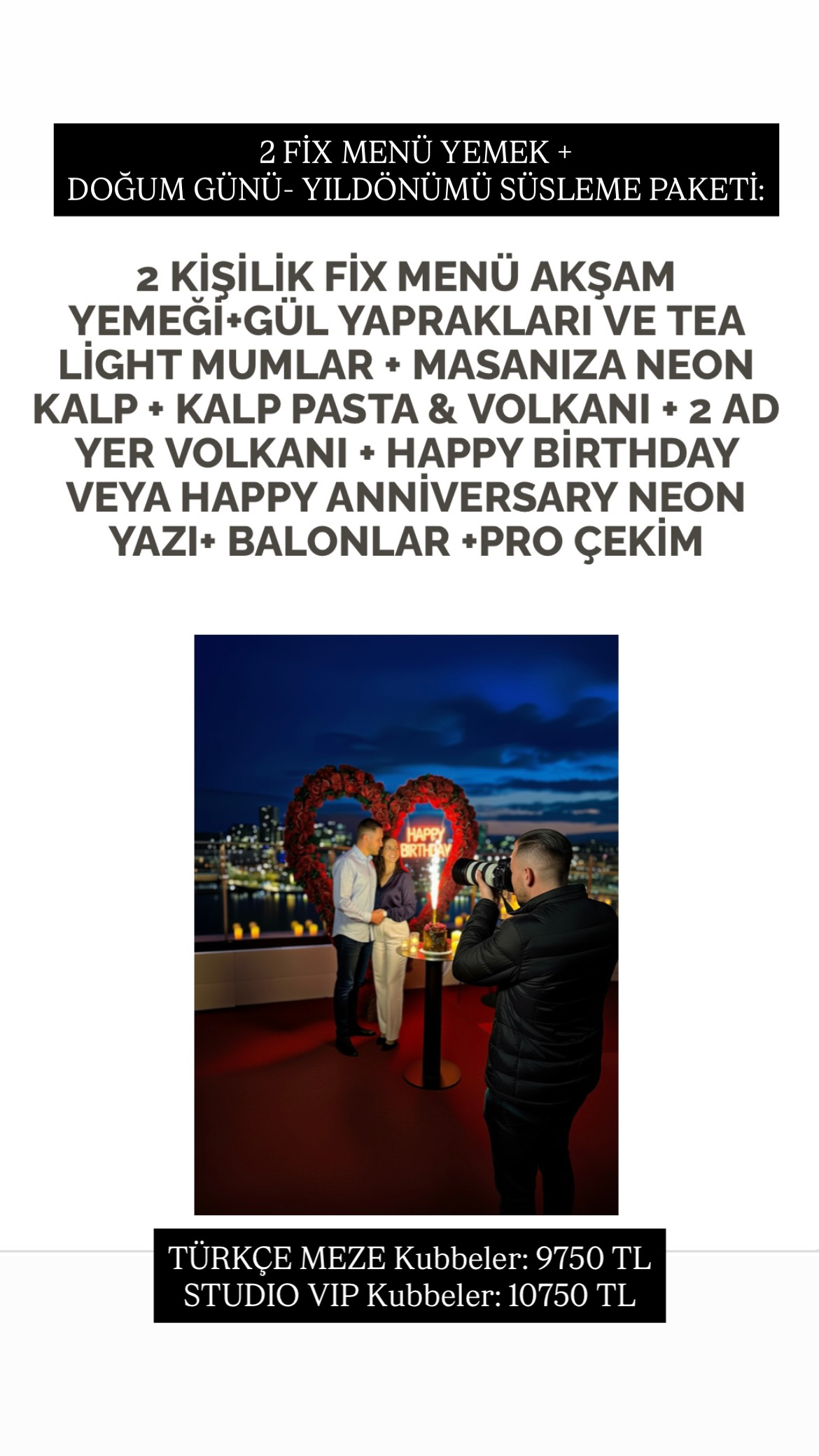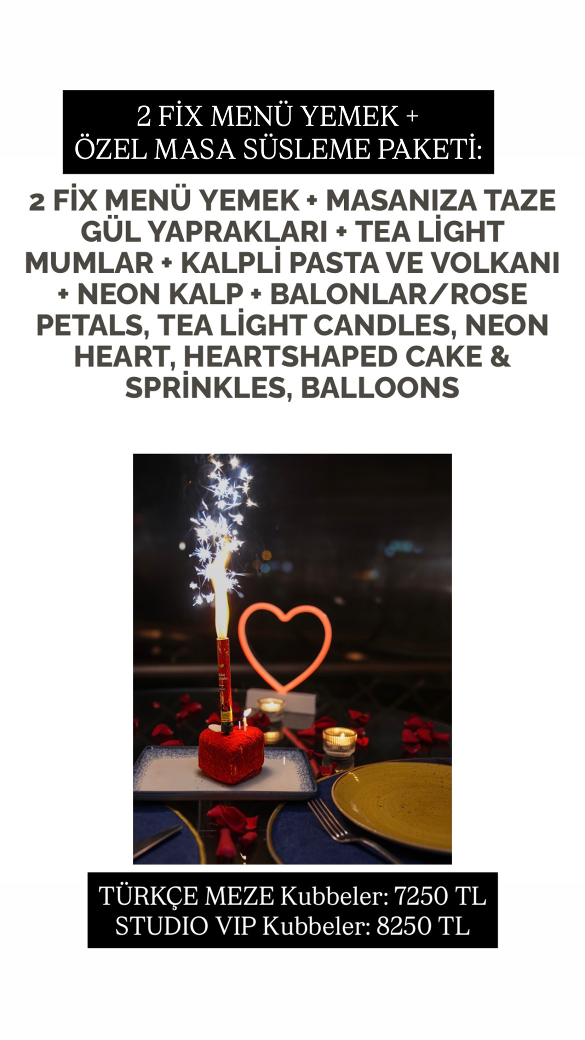 Masanıza taze gül yaprakları, tea light mumlar, neon kalp, kalp şekilli pasta & volkanı, 2 ad yer volkanı, ‘Happy Birthday’, ‘Marry Me?’ veya 'Happy Anniversary' neon yazı, sınırsız çay,pro foto çekim