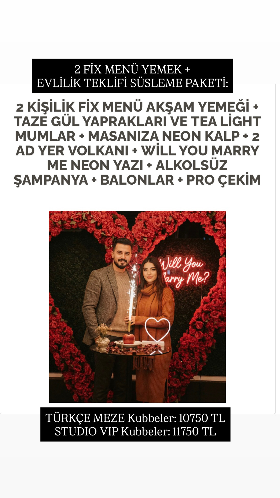 2 kişilik fix menü akşam yemeği + taze gül yaprakları ve tea light mumlar + masanıza neon kalp + 2 ad yer volkanı + Will You Marry Me neon yazı + alkolsüz şampanya + balonlar + PRO ÇEKİM